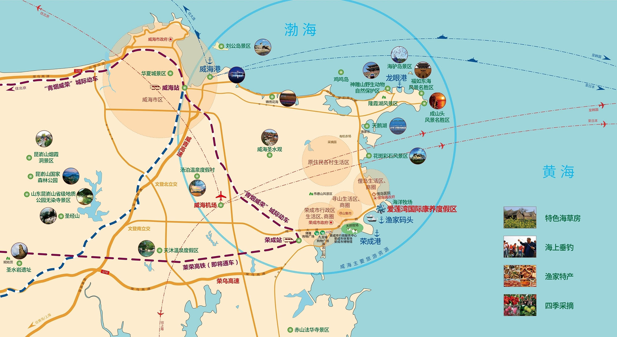 荣成冬无严寒夏无酷暑,旅游资源占整个威海的80%以上,旅游景点大都分布在爱莲湾周边。向北有花斑彩石景区、原生态天鹅湖景区、国家4A级成山头风景区、西霞口野生动物园、摩天岭、鸡鸣岛、海驴岛,向南有4A级赤山风景区、道教圣地九顶铁槎山等,荣成的特色建筑—海草房,可以让您体验童话般的渔家生活。驱车不足一小时范围内可畅享汤泊、天沐等知名温泉。